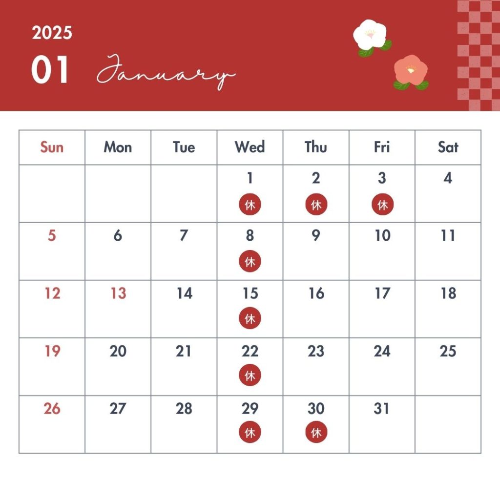 1月の定休日 2025 1/17 2025年1月17日 厳しい寒さが続きますが、いかがお過ごしでしょうか? 1月の定休日ご案内です。 2026年 2月日月火水木金土12345678910111213141516171819202122232425262728 2026年 3月日月火水木金土123456789101112131415161718192021222324252627282930311234 定休日 お知らせ 栗きんとん 2月の定休日